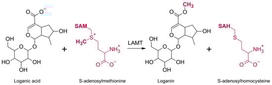 The biosynthesis of secologanin has been described in detail for pink periwinkle (Catharanthus roseus). This process starts with the primary metabolite geranyl pyrophosphate, which is converted to geraniol derivatives, which then form nepetalactone. It undergoes oxidation, glycosidation and hydroxylation to loganic acid. The next step of biosynthesis is catalyzed by LAMT. This process is a one-step reaction and involves the transfer of a methyl group from the SAM cofactor to one of the oxygen atoms of the carboxyl group of the loganic acid. As a result, SAH and a methyl ester of loganic acid (loganin) are formed (Figure 1). Loganin is then converted into secologanin by its synthase [10].