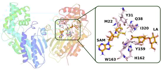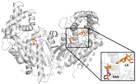 Crystal structure of loganic acid methyltransferase (PDB code 6C8R). The black insert shows a close-up of the enzyme’s active site, where S-adenosylhomocysteine (SAH) and loganic acid (LA) are bound.