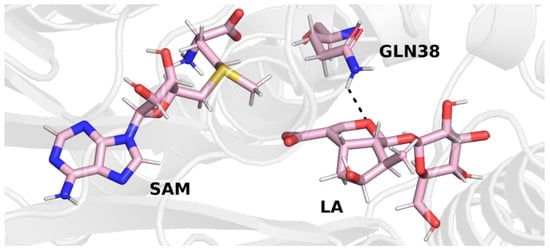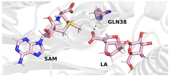 In trajectory 1, this bond was formed between the oxygen atom of the iridoid ring and the amino group of the glutamine residue. This observation is interesting because in other methyltransferases from the SABATH family, this residue is responsible for binding the carboxyl group of the substrate. Nevertheless, it is possible that glutamine 38 has a different function in loganic acid methyltransferase (Figure 4).