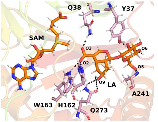 Molecular dynamics simulations enabled the reconstruction of the native conformations of loganic acid methyltransferase and the characterization of interactions between the substrate and the enzyme. In the simulations, the structure of the active site of the enzyme was reorganized. It was observed that glutamine 38 forms a hydrogen bond with the carboxyl group of loganic acid due to a change in the conformation of the side chain. The role of Q38 in substrate binding was postulated in earlier studies focusing on the analysis of the LAMT crystal structure and mutations. Petronikolou et al. [11] also suggested that H162 and W163 residues are involved in interactions with the carboxyl group of the substrate, in addition to Q38, which was confirmed in our work.