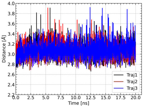 For further characterization of the LAMT complex with loganic acid and the cofactor, the distance between the carbon atom of the reactive methyl group of S-adenosylmethionine and the methylated oxygen atom of the substrate was calculated. This distance is of great importance from the point of view of the reaction catalyzed by the methyltransferase because it corresponds approximately to the reaction coordinate. For large distances, the methyl group must first approach one of the oxygen atoms of the carboxyl group of the loganic acid, and only then can the methyl group be transferred. For this reason, the reaction barrier is associated not only with the breaking and formation of chemical bonds but also with conformational changes within S-adenosylmethionine. For this reason, short distances between the methyl group and its acceptor are more conducive to the methylation reaction. During each trajectory, the distance between the carbon atom of the methyl group of SAM and the nearest oxygen atom of the substrate carboxyl group is stable and rarely exceeds 3.4 Å (Figure 9). This observation additionally supports the conclusion about the stability of the simulations of molecular dynamics and the SAM–loganic acid interactions occurring therein.