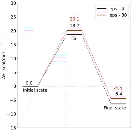 In order to check the influence of the choice of dielectric constant on the reaction barrier, the solvation energy was calculated using two diverse dielectric constants (ε = 4 and 80). Changing the value of the dielectric constant from 4 to 80 increased both the reaction barrier and the final state energy. However, these differences are so small that the choice of dielectric constant does not significantly affect the interpretation of the obtained energy profiles. This means that most of the significant electrostatic interactions were taken into account during the construction of both models.
