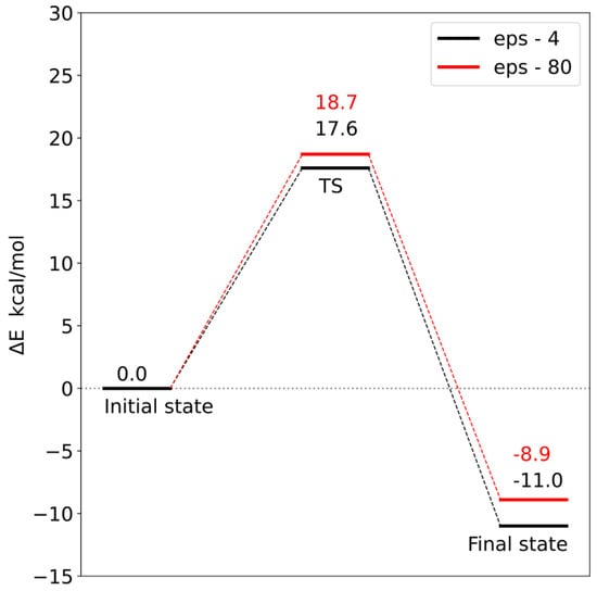 After determining the structure of stationary points, energy corrections were calculated for both models. In order to obtain more accurate values of the electronic energy, single-point calculations were performed using the Def2-QZVP basis set. In the case of DFT methods, the use of a larger basis set than Def2-QZVP does not lead to a further increase in the accuracy of the results due to the basis set limit [27]. The solvation energy was also calculated using the CPCM implicit model with two different dielectric constants (4 and 80) [29,30]. System vibrations at 0 K were taken into account by computing zero-point energy (ZPE). The final energy is the sum of the electronic energy calculated using the Def2-QZVP basis set, the solvation energy (ε = 4 or 80) and the zero-point vibrational energy.