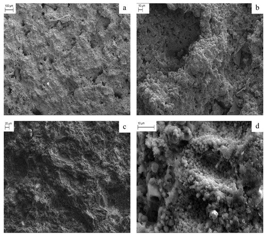 SEM images of biomicrite limestone treated with a 5% (a,b) and 12% w/w (c,d) solution of compound 2.
