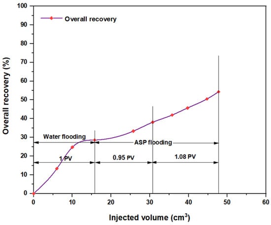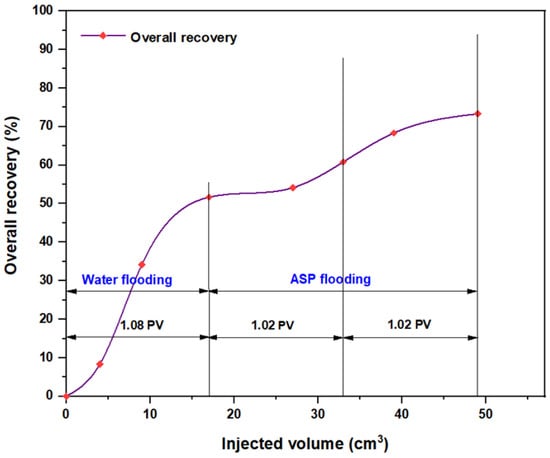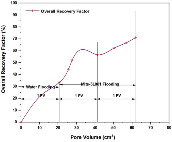 For the Mits-5L001 surfactant (0.01 wt.%), the RF was slightly above 1.2 (1.239) and the RFF was below 1.2 (1.0784), but the adsorption rate was less than 0.4; therefore, this surfactant was considered satisfactory in adsorption and was used in the final ASP slugs. For PSCTM HOMF (0.01 wt.%), the RF, RFF, and adsorption rates indicated its successful application. PSC EOR 2.2 (0.01 wt.%) also showed good performance, as the three mentioned criteria for adsorption were satisfied. For Dekasurf SF 9136 (0.01 wt.%), both the RF and RFF values were satisfactory (<1.2), but the adsorption rate was above the recommended value. Despite fulfilling two criteria out of three, this surfactant was excluded from the final ASP tests. This was because this product appeared to be more affected by the temperature, as demonstrated by the compatibility test. In this test, its quantity was reduced during the fourth and fifth days due to the continued exposure to heating at 60 °C. Moreover, this was confirmed in the direct injection test for this surfactant, as shown in Figure 21. Results demonstrated that the oil recovery portion was the smallest “in value” in comparison to the other surfactants involved in flooding, as shown in Figure 22, Figure 23 and Figure 24.