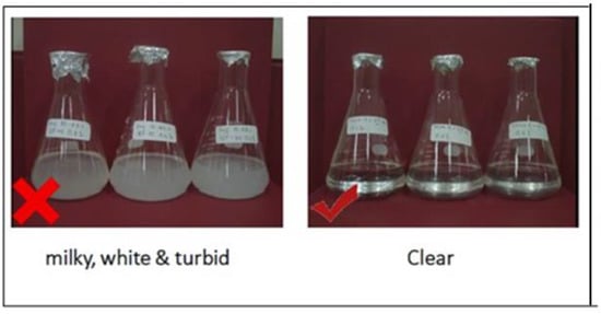 The Mits-5L001 solution was manufactured by Mits Duta Utama located in Cikarang Utara, Bekasi Regency in Indonesia. It was a clear liquid with a yellowish color, and its viscosity was less than 50 cp. It was considered non-flammable and stable under normal conditions. The suitability of this surfactant was confirmed by the images taken during the five days of observation under reservoir conditions (60 °C). Moreover, the flash temperature for Mits-5L001 is around 91 °C, which makes it more resistant to harsh conditions. The yellowish color of its original solution disappeared during the preparation process as a result of dilution with brine water (100 ppm). Thus, it appeared colorless, as seen in the captured images. Figure 15 shows the effect of the temperature on the stability of this surfactant.