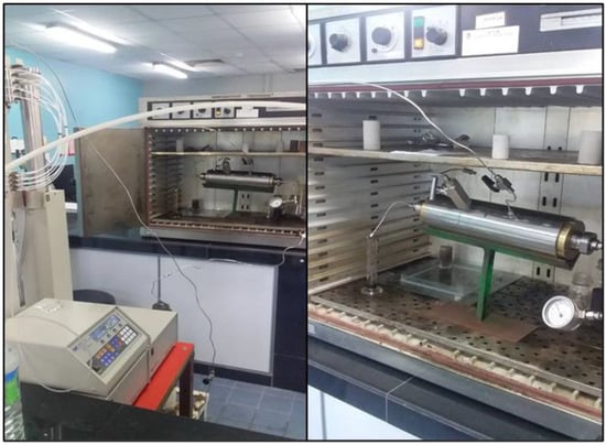 - Standard Electrical Oven: To replicate the conditions of the Langgak oilfield, a temperature of approximately 60 °C was maintained and applied on the core holder and core sample. The temperature was verified using a thermocouple measurement, ensuring that it remained at the desired level throughout the experiment.