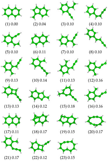 Following the procedure described in Section 2.3, a set of 23 relevant minima (including the naphthalene molecule itself) was selected from the second stage of the exploration (see Figure 1). Three isomers maintain the two six-member rings of the naphthalene molecule (isomer 1), either with a distortion (isomer 19, referred as “twist form” in [29]) or with the displacement of a hydrogen atom (H-shift, isomers 6 and 17). Another group of isomers exhibits a re-organization of the structure of one or both of the rings. This group includes structures with a six-member ring that is combined with (i) a second ring containing four carbons atoms associated with a 2-carbon lateral chain (isomers 13 and 22) or (ii) a second ring containing five carbon atoms associated with a vinylidene group (isomers 2 and 14) plus a H-shift in the case of isomer 14. Note that isomer 18 can be placed into this latter group, with the ring rearrangement leading to the presence of a bicyclobutane motif. The opening of the central C=C bond can lead to another isomer family composed of a single large 10-member ring (isomers 20 and 23). A family comprising eleven isomers is characterized by the opening of one of the two six-member rings, while the second one remains unchanged. This results in an aromatic ring associated with (i) a single four-carbon chain (isomers 4 and 8), possibly branched (isomer 7), (ii) two two-carbon chains (isomers 3 and 5), (iii) a three-carbon chain and a vinylidene function (isomers 9, 10 and 11) or a methyl group (isomers 12, 16 and 21). Finally, isomer 15 presents an intermediate size ring containing seven carbon atoms associated with a two-carbon chain and a methyl group.