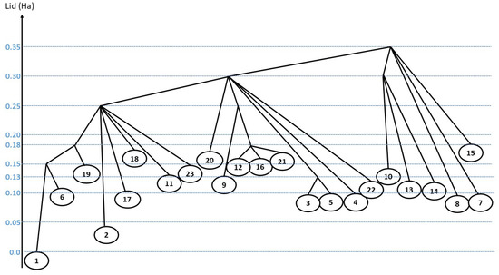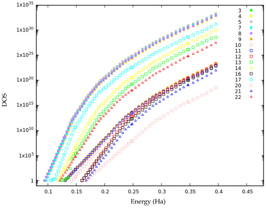 It is possible to highlight two different merged basins at lid 0.40 Ha. The first merged super-basin consists of isomers 1, 6, 18 and 19 (green in Figure 7). Above lid 0.20 Ha, isomers 6 and 19 have the same slope as the ground state and thereby merge into the bigger basin. This is also reflected in the high values of and above lid 0.18 Ha. For isomer 18, the merging takes place at higher energy: around lid 0.25, at which it is first connected to the ground state, with varying in the range 30–45% for higher lids. This is in agreement with the transition graph as isomers 6, 18 and 19 have the highest probability to connect to the ground state for all lid values. The remaining isomers, except isomers 2, 15 and 23, all exhibit the same slope in their local DOS at lid 0.40 Ha and thereby constitute the second merged basin (in red in Figure 7). Three subgroups of this merged basin are already noticeable below lid 0.25 (Figure 8).