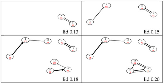 The probability flow between a starting minimum i and another minimum j can be deduced as described in Section 2. is the probability to be in the starting basin i of the threshold trajectory, after leaving it temporarily or not. is sometimes colloquially called a return probability [53] and is often taken as a measure of the stability of the minimum basin at the threshold energy. These flows can be gathered to build a transition matrix for each lid energy. The selection of the largest terms of this matrix allows us to draw a representative map of (closely connected pieces of) the potential energy surface and to visualize the intensity and the direction of the flows (Figure 3 and Figure 4). Attractive and easily depopulated basins can therefore be identified on this map. Note that the probability flow reflects the entropic barrier and not the energetic barrier between two basins at a given energy level; the energetic barriers are deduced from the lid value where, for the first time, a path between two basins can be constructed that completely lies below the lid (i.e., the disconnectivity graph in Figure 2).