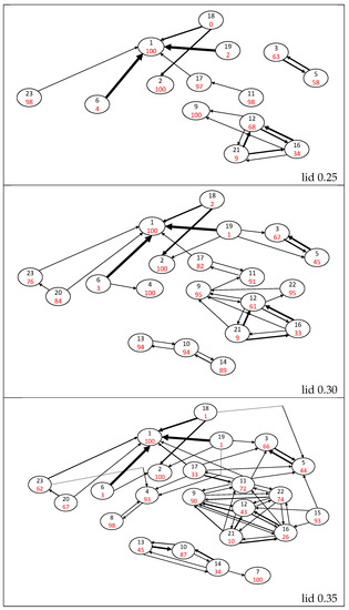 Probability flow graphs for lid values up to 0.25, 0.30 and 0.35 Ha. Isomers are represented by circles with the isomer number in black and the return probability percentages in red. The width of the black arrows is roughly proportional to the values of flows (those below 1% are ignored), where the largest width corresponds to a probability over 80%.
