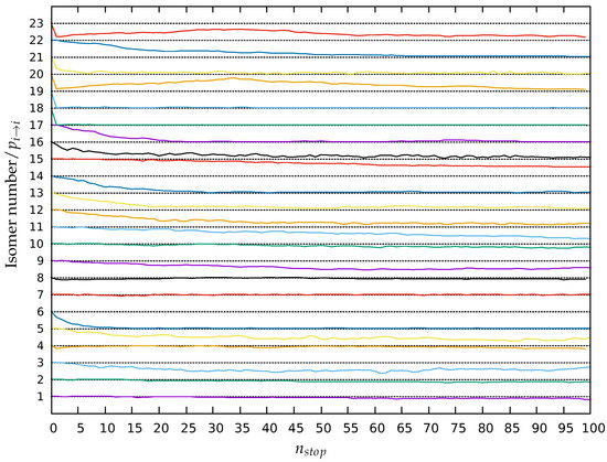 The return probability of the 23 minima at lid 0.40 Ha are depicted in Figure 6 as a function of the stopping point number ( from 0 to 100). Note that we have 100% probability to be in the starting minimum at 0 by definition and that the values of indicated in red in Figure 3 and Figure 4 correspond to the mean values of these graphs over the whole trajectory. This demonstrates that the ground state and isomers 2, 4, 7, 8 and 10 are highly relevant minima basins of the landscape because their stability remains high along the whole trajectories emanating from them. Minima 7 and 8 are so stable that their return probabilities can increase and equal 1 along their trajectories. On the other hand, minima 6, 12, 13, 14, 16, 17 and 22 appear to be side minima whose stability rapidly decreases and reaches almost zero. The return probabilities of isomers 18, 19, 20, 21 and 23 collapse at the first stopping point: these high energy isomers are highly unstable and rapidly transform to a more stable minimum. Minima 3, 5 and 9 appear to be partially stable as their return probabilities decrease along the trajectories and stabilize at a final value different from zero. The local equilibrium between isomers 3 and 5 is progressively established, eventually resulting in a higher return probability for isomer 3 as it is more stable. It is noticeable that the return probabilities of minima 11, 15, 20 and 23 have not stabilized by the end of the threshold trajectories. For the two latter ones, this is due to isomer 23 (and thus also for isomer 20 because of the large value of ) having a high probability to leave the set of 23 relevant minima. The temporary maximum of the return probability of isomers 20 and 23 around the stopping point 35 is due to the return of the walker exploring the energy landscape outside of the set at the early stages of the trajectory. This explains why the relations are not respected (see Figure 5). Similarly, the return probability decreases for minima 11 and 15 and is still not stabilized after the simulated 100 stopping points.