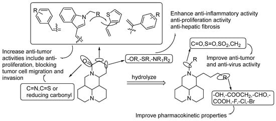 The research of matrine derivatives in recent years mainly includes the following two aspects. First, with technological progress in separation and purification, structure identification, bioactivity-oriented tracking, and other aspects, the extraction and separation of natural compounds from Sophora flavescens and the analysis of its components have been extensively studied in order to find novel alkaloids with higher activities. With the increasing investment in the development of new drugs, many new natural matrine-type alkaloids have been discovered and their biological activities have been tested. These newly discovered structures may provide new ideas for further study of the structural modifications of matrine. The second aspect is to modify the structure of matrine using chemical methods, and then design synthetic routes and evaluate the biological activities of the new compounds. Researchers have performed a lot of structural modifications on matrine. Published studies mainly focused on the modification of the D-ring, the derivatization of C-13, C-14 and C-15, opening the D-ring, and combining the D-ring with some aromatic rings. The structure–activity relationship of matrine has also been proposed in many studies on structural modifications.