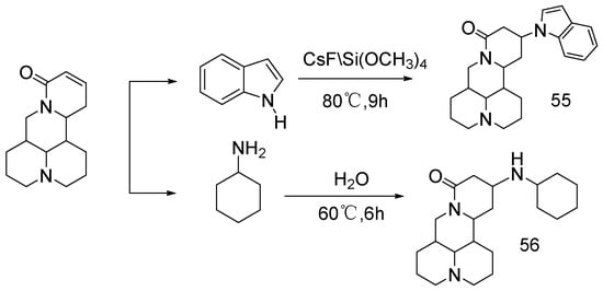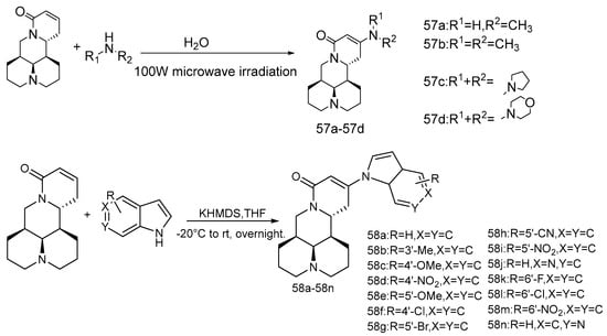 Cheng et al. [54] reported the synthesis of compounds 55 and 56 (Scheme 1) using sophocarpine as the raw material, introducing indole and cyclohexylamine at C-13. The results of bioassay in vitro showed that the cytotoxicity of these two compounds to Hela229 was greater than that of matrine. As reported in previous studies, the introduction of indole or cyclohexylamine groups at D-ring 13 of matrine skeleton can greatly improve its proliferative activity against cancer cells. It was noted that compound 55 showed stronger activity than 56, possibly increasing its permeability to the cell membrane due to the introduction of indole.