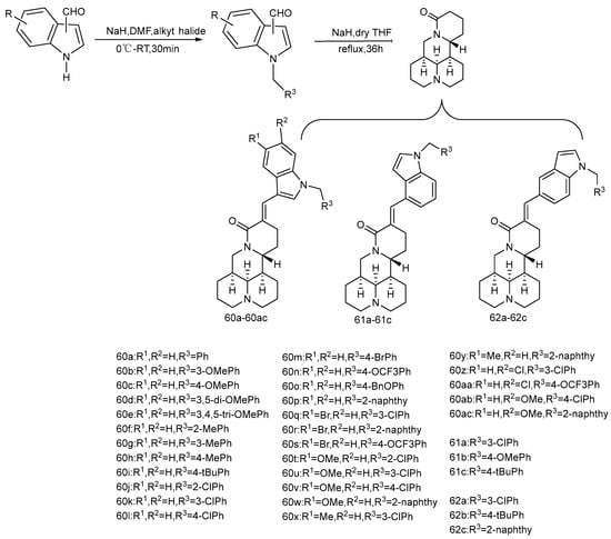 The introduction of double bonds and aromatic rings to matrine C-14 can greatly improve its anti-cancer activity, such as YF18 [67] and YYJ18 mentioned above. In addition, the introduction of nitrogen-containing heterocyclic rings is a common strategy for the structural modification of natural products, because nitrogen atoms can affect the interaction between molecules and their targets. Both N-substituted pyrrole group and N-substituted indole group can increase the pharmacological activity of anti-cancer agents. Based on this, Li et al. [68] designed and synthesized a series of 14-(N-substituted-2-pyrromethylene) and 14-(N-substituted—indolemethylene) matrine derivatives (Scheme 7 and Scheme 8). Three human cancer cell lines, SMMC-7721, A549, and CNE2, were selected for in vitro cytotoxicity test. The results showed that all matrine derivatives were more cytotoxic to all three types of cells than matrine. Compounds 59F and 60u have the most significant anti-tumor activity, which are superior to the positive control drug cisplatin. Replacing 14-H of matrine with a 1-methyl-2-pyrrolemethylene group offered compound 59A, which showed poor activity (IC50 > 100 μM), while compound 59B possessing a 1-benzyl-2-pyrrolemethylene group at the same position exhibited a greatly improved anti-cancer activity and was about 115–172 times lower than that of matrine. It could be inferred that the introduction of a benzyl moiety on the nitrogen atom of pyrrole could significantly improve the anti-cancer activity indicating that benzyl might interact with a large pocket within the binding site. The mechanism of anti-proliferative activity of 59F and 60u showed that they induced apoptosis of CNE2 and SMMC-7721 cells in a dose-dependent manner, compound 59F can arrest the cell cycle of CNE2 and SMMC cells in G2/M phase, and compound 60u does not show significant cell cycle arrest.