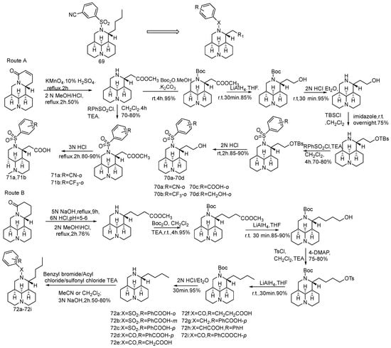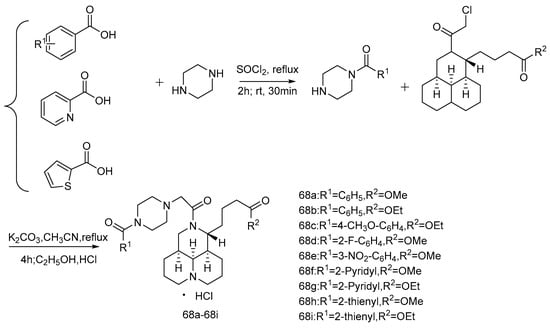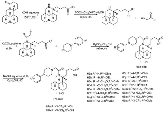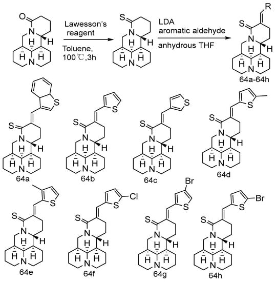 It has been reported that matrine can reverse the drug resistance of breast, lung, and bladder cancers. Based on the good cytotoxicity of thiophene compounds in anti-cancer drugs, Wei et al. [70] designed and synthesized eight matrine derivatives (Scheme 10) containing thiophene groups to search for novel compounds that could exhibit significant reversal effects in vitro and in vivo. In vitro activity experiments show that the eight compounds have cytotoxic and preliminary synergistic effects on nasopharyngeal carcinoma cells and cisplatin-resistant nasopharyngeal carcinoma cells (CNE2/CDDP). Compound 64f and CDDP (cis-diamminedichloroplatinum) show significant synergistic inhibitory effects on leukemia, breast, and bladder cancer cells in vitro and in vivo, based on the high risk of thiophene compounds. The preliminary in vivo toxicity evaluation of 64f was also carried out. The results show that 64f has no obvious toxicity in mice under physiological conditions.
