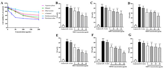 2.2. Effect of TBFE and Five Extract Fractions on Macrophage Viability and In Vitro Anti-Inflammatory Activity