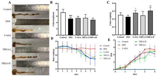 2.3. Amelioration of Physiological Characteristics and Colonic Injury in UC Mice with TBEA