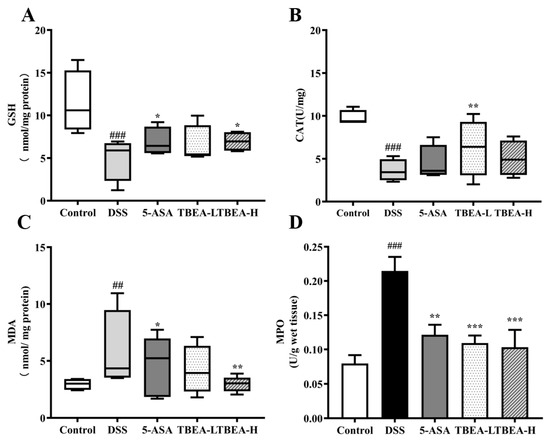 2.4. TBEA Reduces the Level of Oxidative Stress in the Colonic Tissue of UC Mice