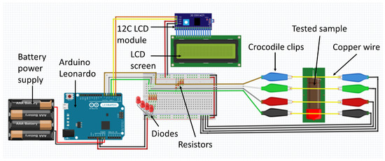 Electrical resistance measurement methods were used to determine the linear combustion velocity. The utilised experimental set-up (Figure 1) measured the time between state changes (conducting/non-conducting) at the inputs. These changes were caused by the moving flame front and the burning through of successive wires attached to the sample. The measuring device used gave the time in which the flame front covered the distance with millisecond accuracy.