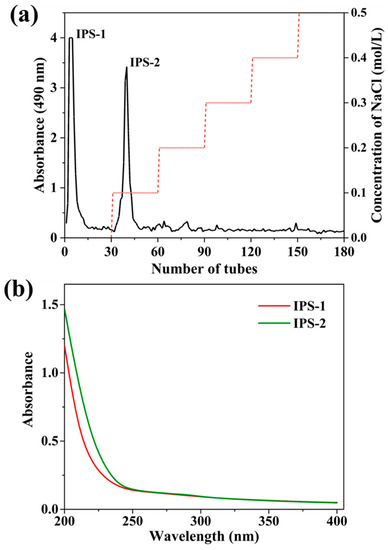 Fractionation profile of intracellular polysaccharides (IPS-1 and IPS-2) extracted from P. radiatolobatum by DEAE-Sepharose fast flow column chromatography eluted with different concentrations of NaCl (0, 0.1, 0.2, 0.3, 0.4, and 0.5 M), examined using phenol-sulfuric acid assay (a), and UV spectrum of IPS-1 and IPS-2 (b).