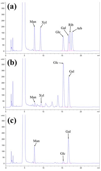 Chromatogram of standard monosaccharide mix (a), the composition of monosaccharides in the intracellular polysaccharides (IPS-1) (b), and IPS-2 (c) extracted from P. radiatolobatum, determined by using high-performance liquid chromatography (HPLC) coupled with UV detector.