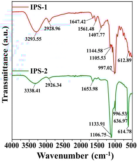 The functional groups of the IPS-1 and IPS-2 were studied by FT-IR analysis at the wavenumber range of 4000–500 cm−1, as presented in Figure 3. The spectrum of IPS-1 indicated strong absorption peaks at 3293.55 cm−1, 2928.96 cm−1, 1647.42 cm−1, 1561.48 cm−1, 1407.77 cm−1, 1144.58 cm−1, 1105.53 cm−1, 997.02 cm−1, and 612.89 cm−1. Meanwhile, the IPS-2 exhibited strong absorption peaks at 3338.41 cm−1, 2926.34 cm−1, 1653.98 cm−1, 1133.91 cm−1, 1106.75 cm−1, 996.53 cm−1, 636.97 cm−1, and 614.78 cm−1. Taken together, the characteristic peaks at 3293.55 cm−1 and 3338.41 cm−1 were associated with the O-H stretching vibrations of the hydroxyl group, and the peaks at 2926.34 cm−1 and 2928.96 cm−1 were ascribed to C-H stretching vibrations in the methylene group [14,16,20]. In addition, the characteristic peaks at 1647.42 cm−1 and 1653.98 cm−1 were accredited to the C=O stretching vibrations [33]. However, the characteristic peaks in IPS-1 at 1561.48 cm−1 and 1407.77 cm−1 were due to C-O vibration and C-H bending vibration, respectively [24,34], but IPS-2 did not exhibit those same peaks (Figure 3). The characteristic peaks in the range of 1100–1150 cm−1 were attributed to the C-O stretching vibrations typically associated with primary or secondary alcohols in polysaccharides [16]. The strong peaks at 996.53 cm−1 and 997.02 cm−1 were ascribed to the C-O-C stretching vibrations [24,33]. Additionally, the peaks around 600 cm−1 (IPS-1 and IPS-2) were associated with the bending vibrations of a polysaccharide ring [35]. Overall, the FT-IR analysis confirmed the polysaccharide nature of IPS-1 and IPS-2 based on the presence of characteristic peaks (3293.55 cm−1, 3338.41 cm−1, 2926.34 cm−1, and 2928.96 cm−1) associated with sugars (Figure 3) [11].