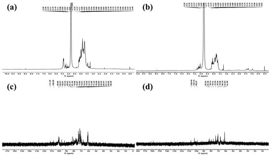 Structural characterization of the intracellular polysaccharides (IPS-1 and IPS-2) extracted from P. radiatolobatum using NMR spectroscopic analysis: 1H NMR spectra of IPS-1 (a) and IPS-2 (b) and 13C NMR spectra of IPS-1 (c) and IPS-2 (d).