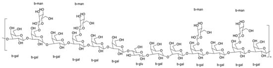 The structural information of IPS-1 and IPS-2 was studied using NMR spectroscopy, as shown in Figure 4. The glycosidic linkages in polysaccharides could be of two different types: α-type or β-type. The hemiacetal (ketone) hydroxyl group arrangement mostly determines the configurations of these bonds. From HPLC results (Figure 2), it was found that the monosaccharide units in IPS-1 were glucose (Glc), galactose (Gal), mannose (Man), and xylose (Xyl), and the peak area values suggested the ratio is like Glc:Gal:Xyl:Man; 13:10:1:0.8. While the monosaccharide units in IPS-2 were Gal, Man, and Glc, and the peak area values suggested the ratio is like Gal:Man:Glc; 12:4:1. In the 1H-NMR spectrum, the chemical shifts of the IPS-2 signals were mainly distributed in δ 3.4–4.3 and δ 5.1–5.3 (Figure 4a). However, the chemical shifts of the IPS-2 signals were mainly distributed in δ 3.6–4.1 and δ 5.0–5.3 (anomeric proton region) (Figure 4b). In the 13C-NMR spectrum, the IPS-1 signals (ppm) were found at 99.82 (C1), 81.36 (C3), 74.13 (C5), 71.76 (C2), 70.38 (C4), 60.58 (C6) (Figure 4c). Similarly, the IPS-2 signals (ppm) were distributed at 102 (C1), 82.61 (C3), 76.4 (C5), 72.79 (C2), 70.34 (C4), 61.09 (C6) (Figure 4d). For the β configuration, the δ was found to be equal to or less than 5.0. Hence, it could predict the stable β configuration of monosaccharide units. The most possible structure of the IPS-2 is depicted in Figure 5. The IPS-2 was mainly composed of the β-(1→4)-D-galactose and β-(1→4)-D-glucose as the main chain, with the β-(1→6)-D-mannose randomly as the branched chain. However, it is generally considered that polysaccharides with β-configuration have higher activity in comparison to their corresponding α-configurations [36].