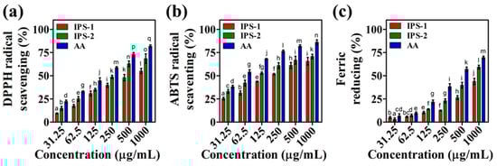 The reduction of the blue-green ABTS+ chromophore (generated via potassium persulphate and ABTS reaction) into the colorless product, accompanied by absorption detection at 734 nm, is considered an indicator of the ABTS+ scavenging activity of an antioxidant molecule [38]. The findings of this study indicated the concentration-dependent ABTS+ scavenging activity of the tested samples (IPS-1, IPS-2, and AA). The highest ABTS+ scavenging activity was examined for AA (86.16%), IPS-1 (65.63%), and IPS-2 (70.70%), at 1000 μg/mL concentration (Figure 6a). Moreover, the IC50 of IPS-1, IPS-2, and AA was defined as 223 ± 2.0 μg/mL, 108 ± 2.5 μg/mL, and 54.5 ± 1.25 μg/mL, respectively (Table S1). Similarly, the IPS isolated form Craterellus cornucopioides is reported to scavenge the ABTS radicals in a concentration-dependent manner with an IC50 value of about 150 μg/mL [19]. However, the IPS fractions of Agaricus bitorquis (Quél.) Sacc. Chaidam (ABSC)- ZJU-CDMA-12 is reported to scavenge the ABTS radicals but requires a high concentration dose [15]. Moreover, in a previous study, a polysaccharide derived from endophytic Fusarium solani contains a similar monosaccharide composition (Glc, Gal, and Man) to IPS-2, yet compared to IPS-2, their IC50 value (>4000 μg/mL) for ABTS radical scavenging is significantly higher [27].