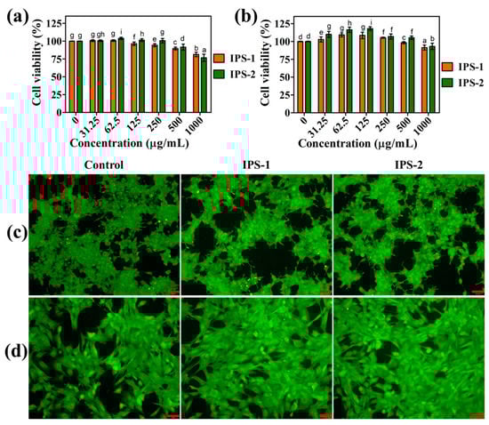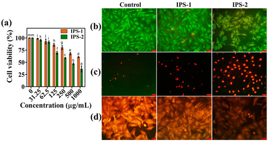 Analysis of the cytotoxic effect of intracellular polysaccharides (IPS-1 and IPS-2) extracted from P. radiatolobatum in human embryonic kidney (HEK-293) cells (a) and mouse embryonic fibroblast (NIH3T3) cells (b) using WST assay, and visualization of nuclear changes in HEK-293 cells (c) and NIH3T3 cells (d) using AO/EB fluorescent staining assay. The results are expressed as the mean and error bars indicate the SD of three independent experiments, and letters on error bars represent significant differences (p < 0.05). The images were captured at 50 µm of scale bar.