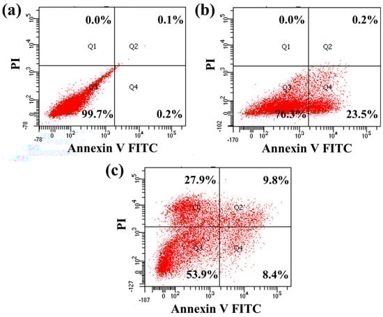 Analysis of apoptotic effect of intracellular polysaccharides (IPS-2) extracted from P. radiatolobatum in human prostate cancer (PC-3) cells using flow cytometry analysis, where the cells were treated with 0 µg/mL (a), 250 µg/mL (b), and 500 µg/mL (c) concentration of IPS-2.