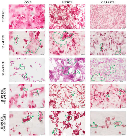 Morphological image of OV7, HTB76 and CRL1572 cells treated with 10 nM PTX, 50 µM CAPE and 10 nM PTX together with 50 µM and 100 µM CAPE after 24 h of incubation. To prepare the samples, a hematoxylin and eosin staining method was used. Exposition: optical magnification ×400. (1)—hyper-chromia, (2)—cell “shadows”, (3)—shortened cytoplasmic protrusions, (4)—weakened cell–cell contact, (5)—cell condensation and pyknotic cell nuclei, (6)—small cells, irregular cytoplasmic outline and densified nuclei, (7)—cells with irregular shape.