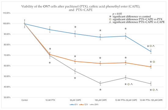 Viability of the OV7 cells exposed to 10 nM paclitaxel (PTX), 50 µM and 100 µM caffeic acid phenethyl ester (CAPE) and paclitaxel with 50 µM and 100 µM caffeic acid phenethyl ester (PTX+CAPE) treatment after 6 h, 12 h and 24 h incubation periods. Cytotoxic properties were assessed using an MTT cell viability assay. The results are presented as the mean and standard deviation of three independent experiments with twelve wells each (p < 0.05; * significant difference vs. control; ° significant difference in PTX vs. PTX+CAPE; ^ significant difference in CAPE vs. PTX+CAPE).