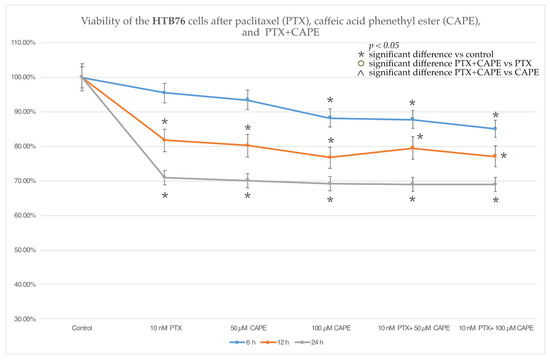 The HTB76 cell line responded to the tested compounds similarly to the ovarian teratocarcinoma cells. After 12 h and 24 h, both PTX, CAPE and PTX administered together with 50 µM and 100 µM CAPE caused a statistically significant decrease in cell viability relative to the control. However, after a 6 h study, no statistically significant change was observed in the viability of the HTB76 cells exposed to 10 nM PTX and 50 µM CAPE. There was no enhancement of the cytotoxic effect of PTX after co-administration with CAPE. The data are presented in Figure 3.