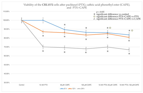 The cytotoxic effects of PTX at a dose of 10 nM on the CRL1572 cells were observed only after the 12 h and 24 h duration of the experiment. The tested doses of CAPE and the administration of PTX together with CAPE caused a statistically significant reduction in cell viability compared to the control. It was also observed that administration of CAPE did not increase the cytotoxic properties of PTX in an experiment lasting more than 6 h. After a 6 h incubation, it was noticed that the administration of PTX together with 50 µM and 100 µM CAPE significantly reduced the viability of the tested cells compared to the use of PTX alone. The described data are presented in Figure 4.