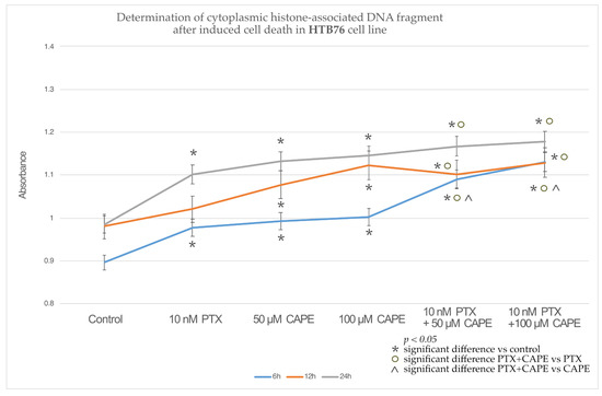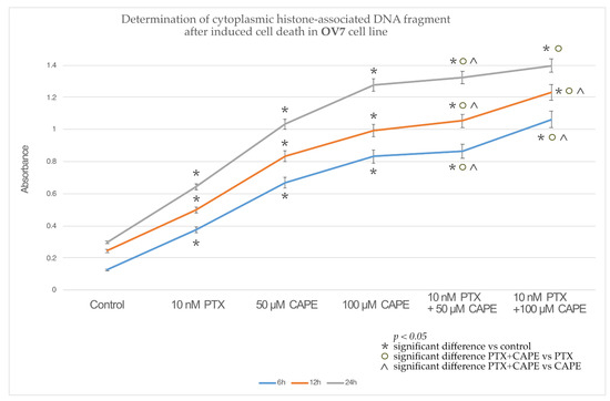An assessment of the percentage of cells that underwent apoptosis was carried out using a cell death ELISA, which quantitates the histone-associated DNA fragments characteristic of apoptotic-body-forming cells. It was shown that the combination of PTX and selected CAPE concentrations significantly increased the concentration of cytoplasmic histone-associated DNA fragments in every tested cell line. A higher concentration of CAPE and a longer duration of incubation increased the pro-apoptotic effect. A statistically significant increase in the percentage of apoptotic cells after the simultaneous administration of PTX and CAPE, compared to the results obtained after the treatment with the flavonoid alone, was most clearly observed in the OV7 cell line. In the HTB76 and CRL1572 lines, the increased pro-apoptotic activity of PTX and CAPE, compared to the administration of CAPE alone, was only statistically significant during the 6 h duration of the experiment.
