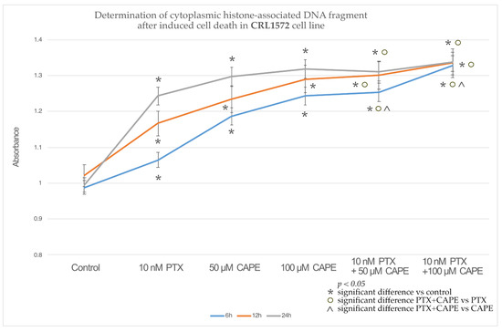 Using the recommendations described by the manufacturer of the assay, the tested lines were plated in 96-well plates and incubated in dedicated growth media until 80% confluence was reached. Next, the following solutions of the test compounds in the growth medium were prepared: 10 nM PTX and 10 nM PTX + 50 µM CAPE and 10 nM PTX + 100 µM CAPE; these were then added to the cell cultures. The cells were incubated for 6 h, 12 h and 24 h, and then the supernatants were prepared. For this purpose, based on the instructions, the cells from plates were shortly trypsinized and centrifuged at 200× g for 5 min. The supernatants were then discarded, and the cell pellets were carefully resuspended in 1 mL of dedicated culture mediums. Again, the samples were centrifuged at 200× g, and after 5 min, 500 μL of incubation buffer was added to each tube with cell pellets. The cell lysis lasted for half an hour, and the samples were stored at room temperature. The lysates were then centrifuged at 20,000× g for 10 min, and 400 μL of the obtained supernatants (containing cytoplasmic fraction) were taken straight to the measurements. Cell nuclei containing high-molecular-weight and unfragmented DNA were left in the pellet and had no effect on the experimental results. The supernatant was prediluted with incubation buffer to a ratio of 1:10 (1 × 104 cell equivalents/mL; the number of cells was determined in a Burker chamber) and the nucleosomes were detected in the sample by immunoassay.