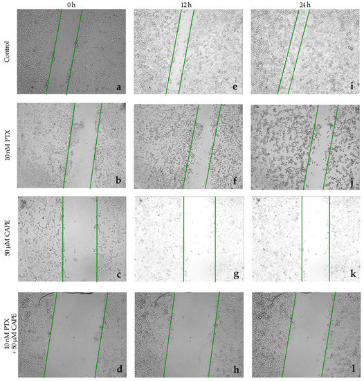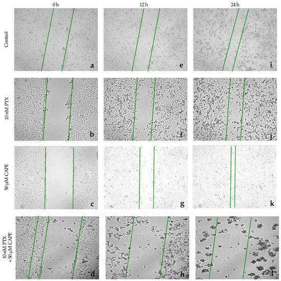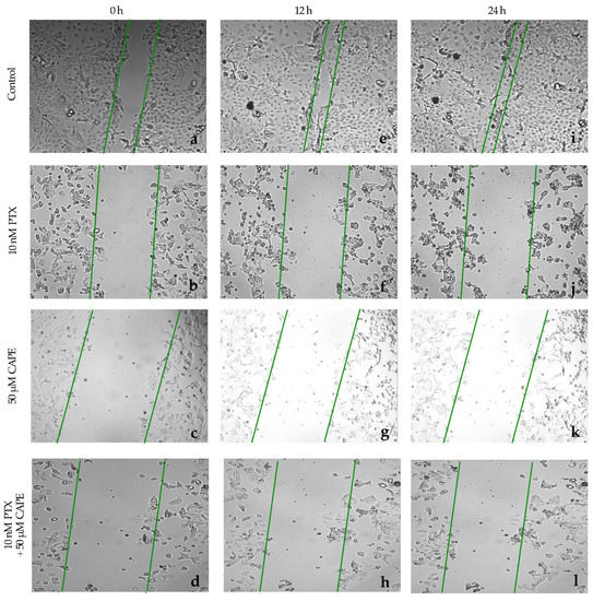 Paclitaxel (PTX), 50 µM caffeic acid phenethyl ester (CAPE) and paclitaxel with 50 µM caffeic acid phenethyl ester (PTX+CAPE) promoted an inhibitory migration effect on CRL1572 cells. Pictures (a–d): scratch area of the CRL1572 cell line at the beginning of the experiment; (e–h): scratch area of the CRL1572 cell line after 12 h incubation time with test compounds; (i–l): scratch area of the CRL1572 line after 24 h incubation with test compounds. The cell migration factor was performed by a wound-closure test and embedded using the ImageJ software version 1.53t.