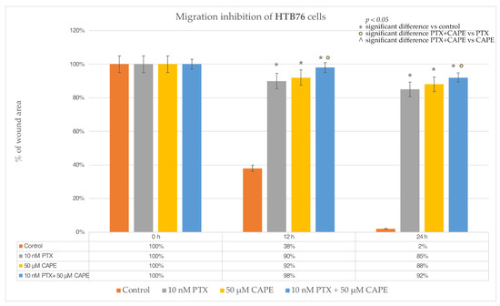 The plot of the dependence of the HTB76 migration inhibition on the time and dose of the tested compounds. The results are presented as the gap area in relation to the area value of the initial scratch after 12 h and 24 h of observation. (p < 0.05; * significant difference vs. control; ° significant difference in PTX + CAPE vs. PTX; ^ significant difference in PTX+CAPE vs. CAPE).