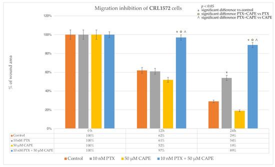 The plot of the dependence of the CRL1572 migration inhibition on the time and dose of the tested compounds. The results are presented as the gap area in relation to the area value of the initial scratch after 12 h and 24 h of observation. (p < 0.05; * significant difference vs. control; ° significant difference in PTX + CAPE vs. PTX; ^ significant difference in PTX+CAPE vs. CAPE).