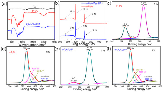 (a) FT-IR spectra of C60, g-C3N4, and g-C3N4/C60@6:1, obtained in transmission mode; (b) XPS survey spectra of spectra of C60, g-C3N4, and g-C3N4/C60@6:1; (c) high-resolution XPS spectra of C 1s for g-C3N4; (d) high-resolution XPS spectra of N 1s for g-C3N4; (e) high-resolution XPS spectra of C 1s for g-C3N4/C60@6:1; and (f) high-resolution XPS spectra of N 1s for g-C3N4/C60@6:1.