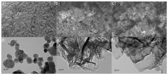 SEM images of (a) C60, (b) g-C3N4, and (c) g-C3N4/C60@6:1 composite and TEM images of (d) C60, (e) g-C3N4 and (f) g-C3N4/C60@6:1 composite.