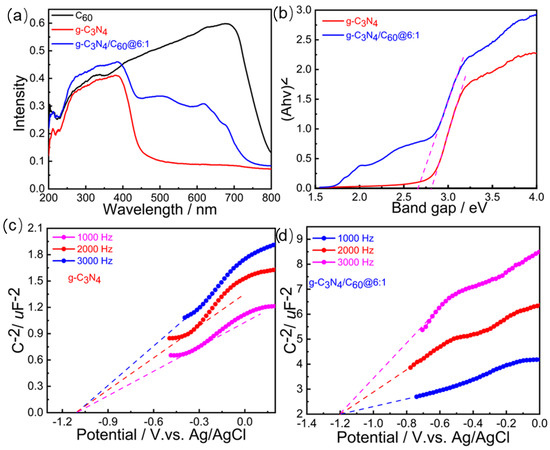 (a) UV-vis diffuse reflectance spectra of C60, g-C3N4, and g-C3N4/C60@6:1. (b) Band gaps of C60, g-C3N4, and g-C3N4/C60@6:1 determined with Kubelka-Munk-transformed reflectance. (c) Mott-Schottky plots of g-C3N4 in 0.2 M Na2SO4 aqueous solution at 1000 Hz, 2000 Hz, and 3000 Hz. (d) Mott-Schottky plots of g-C3N4/C60@6:1 in 0.2 M of Na2SO4 aqueous solution at 1000 Hz, 2000 Hz, and 3000 Hz.
