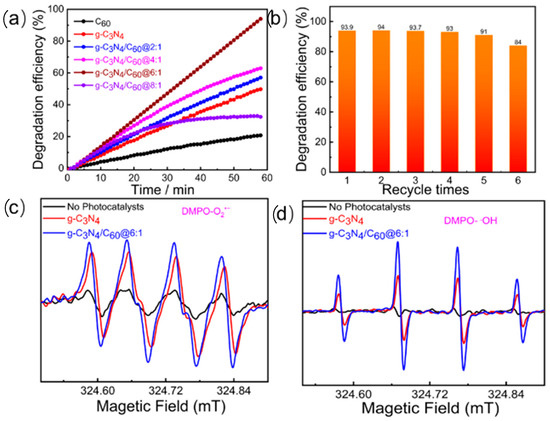 (a) Photocatalytic degradation efficiency of gaseous HCHO (120 ppm); (b) reusability of g-C3N4/C60@6:1 in gaseous HCHO; (c) ESR spectra of g-C3N4/C60@6:1 for detecting O2•−; and (d) ESR spectra of g-C3N4/C60@6:1 for detecting •OH.