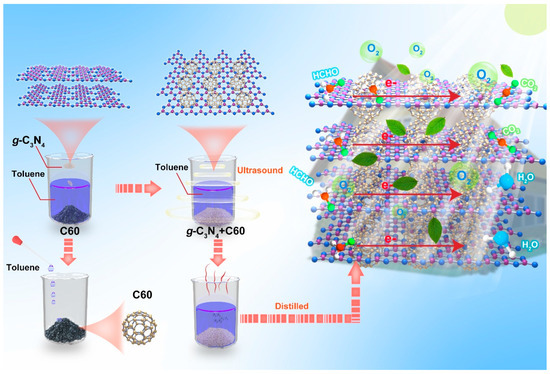 The photocatalytic degradation of formaldehyde by graphite-like C3N4 is one of the most attractive and environmentally friendly strategies to address the significant threat to human health posed by indoor air pollutants. Despite its potential, this degradation process still faces issues with suboptimal efficiency, which may be attributed to the rapid recombination of photogenerated excitons and the broad band gap. As a proof of concept, a series of graphite-like C3N4@C60 composites combining graphite-like C3N4 and C60 was developed via an in situ generation strategy. The obtained graphite-like C3N4@C60 composites exhibited a remarkable increase in the photocatalytic degradation efficiency of formaldehyde, of up to 99%, under visible light irradiation, outperforming pure graphite-like C3N4 and C60. This may be due to the composites’ enhanced built-in electric field. Additionally, the proposed composites maintained a formaldehyde removal efficiency of 84% even after six cycles, highlighting their potential for indoor air purification and paving the way for the development of efficient photocatalysts.