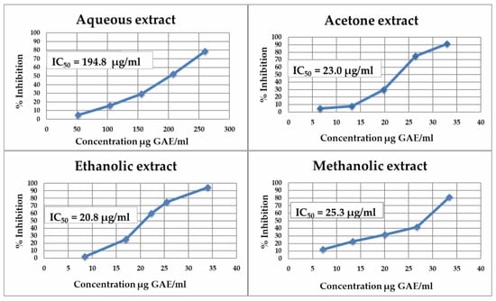 The TPC ranged from 459.8 to 748.4 mg GAE/100 g fw for bilberry fruits from Bulgaria. Figure 1 shows the phenolic compound concentration in the studied bilberry extracts. The lowest amount of phenols was found in the aqueous extract, followed by the methanolic and acetone extracts by an increased amount of substances (597.1 and 689.2 mg GAE/100 g fw, respectively). The ethanolic extract of the fruits of V. myrtillus L. showed the highest content of total polyphenols, which was 39% more than the polyphenol content in the aqueous extraction. It can be observed that the organic samples have higher phenolic content in comparison with the aqueous one. Our data were within the range from 424.84 to 819.12 mg/100 g fw, as reported by Bunea et al. [] and Sellappan et al. [], which is comparable with the value reported by Prior et al. [], which was 525 mg GAE/100 g fw for North American V. myrtillus L. The determined TPC values in the bilberry extracts were lower than those previously reported by Dincheva and Badjakov [].