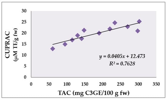Figure 4 illustrates the correlation between the total anthocyanin content and CUPRAC analysis of plant extracts. The results demonstrated a positive correlation coefficient (r = 0.7628) which was highly significant (p < 0.01). In this investigation, it seems that the higher total anthocyanin content of the plant extracts resulted in higher antioxidant activity with respect to the CUPRAC assay.
