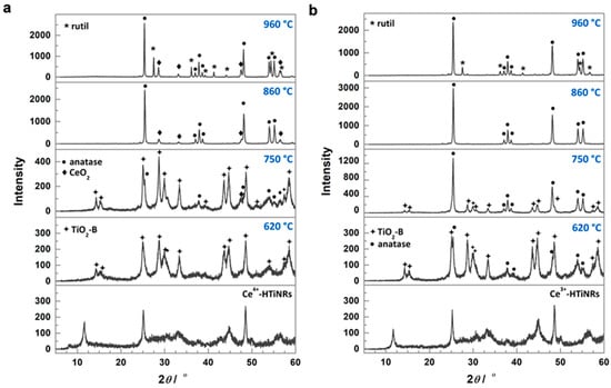 | Ce4+-620 °C | Ce4+-HTiNRs | static air | 620 | TiO2-B | 3.9 | +3, +4 (75%) | 3.30 |