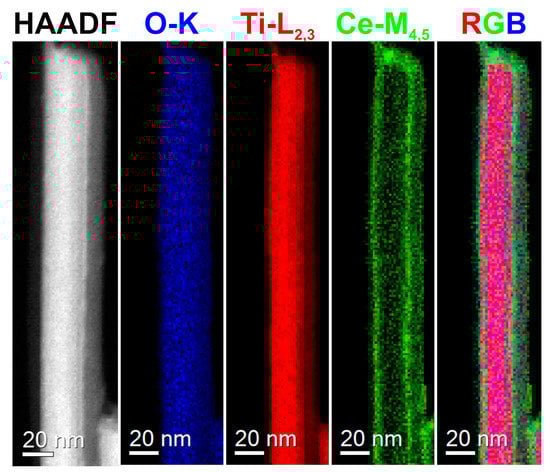 - Marques, T.M.F.; Ferreira, O.P.; da Costa, J.A.P.; Fujisawa, K.; Terrones, M.; Viana, B.C. Study of the growth of CeO2 nanoparticles onto titanate nanotubes. J. Phys. Chem. Solids 2015, 87, 213–220. [Google Scholar] [CrossRef]
